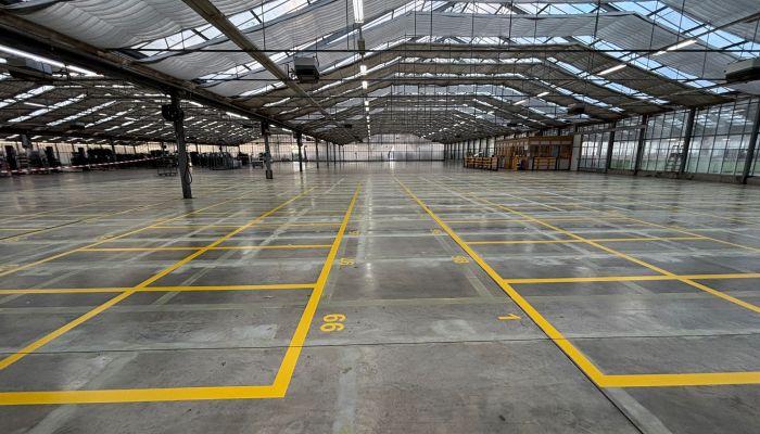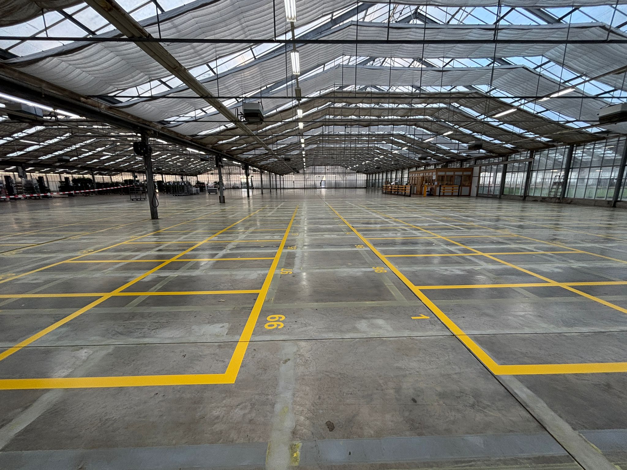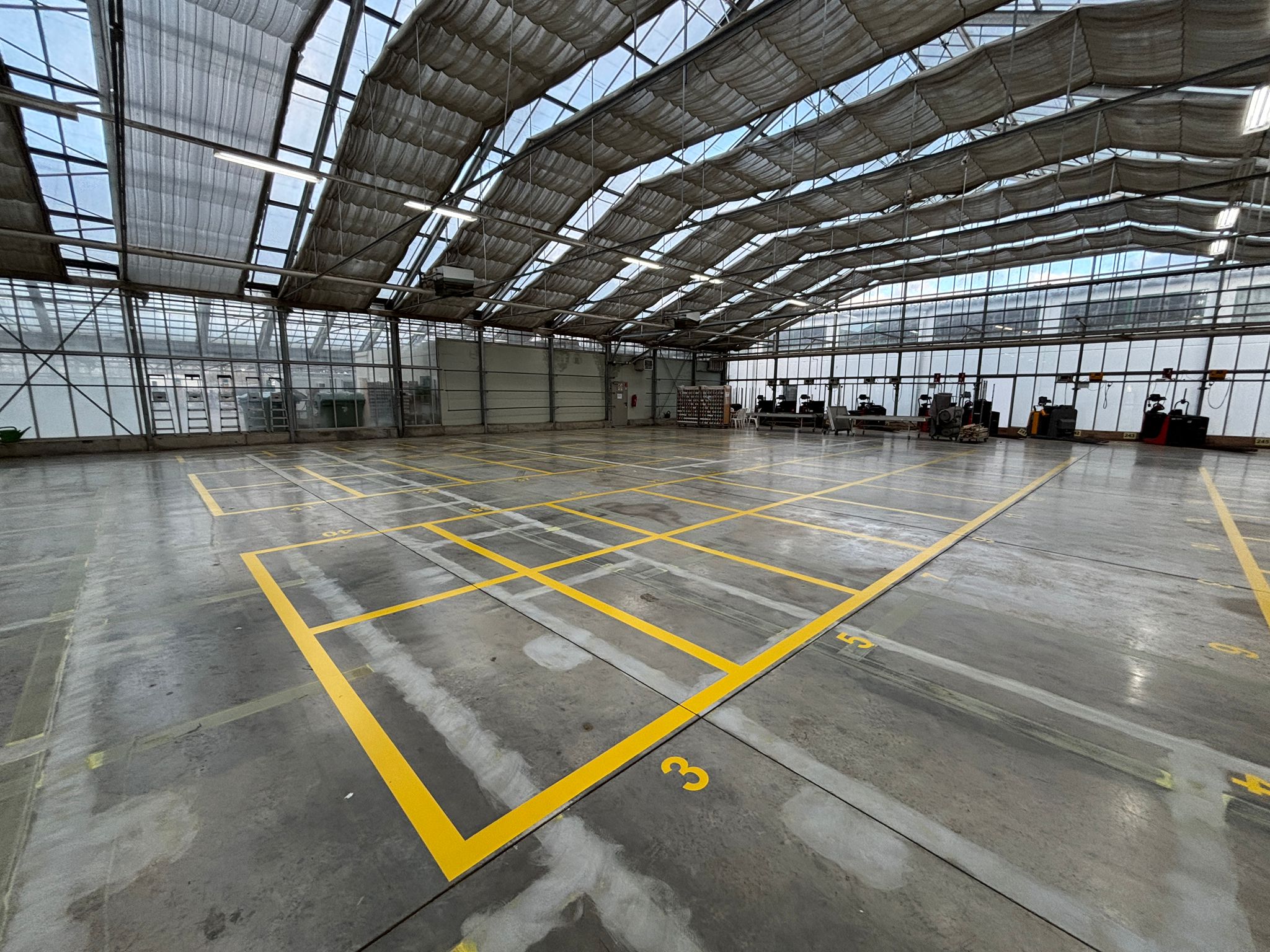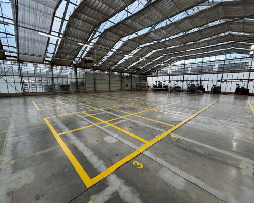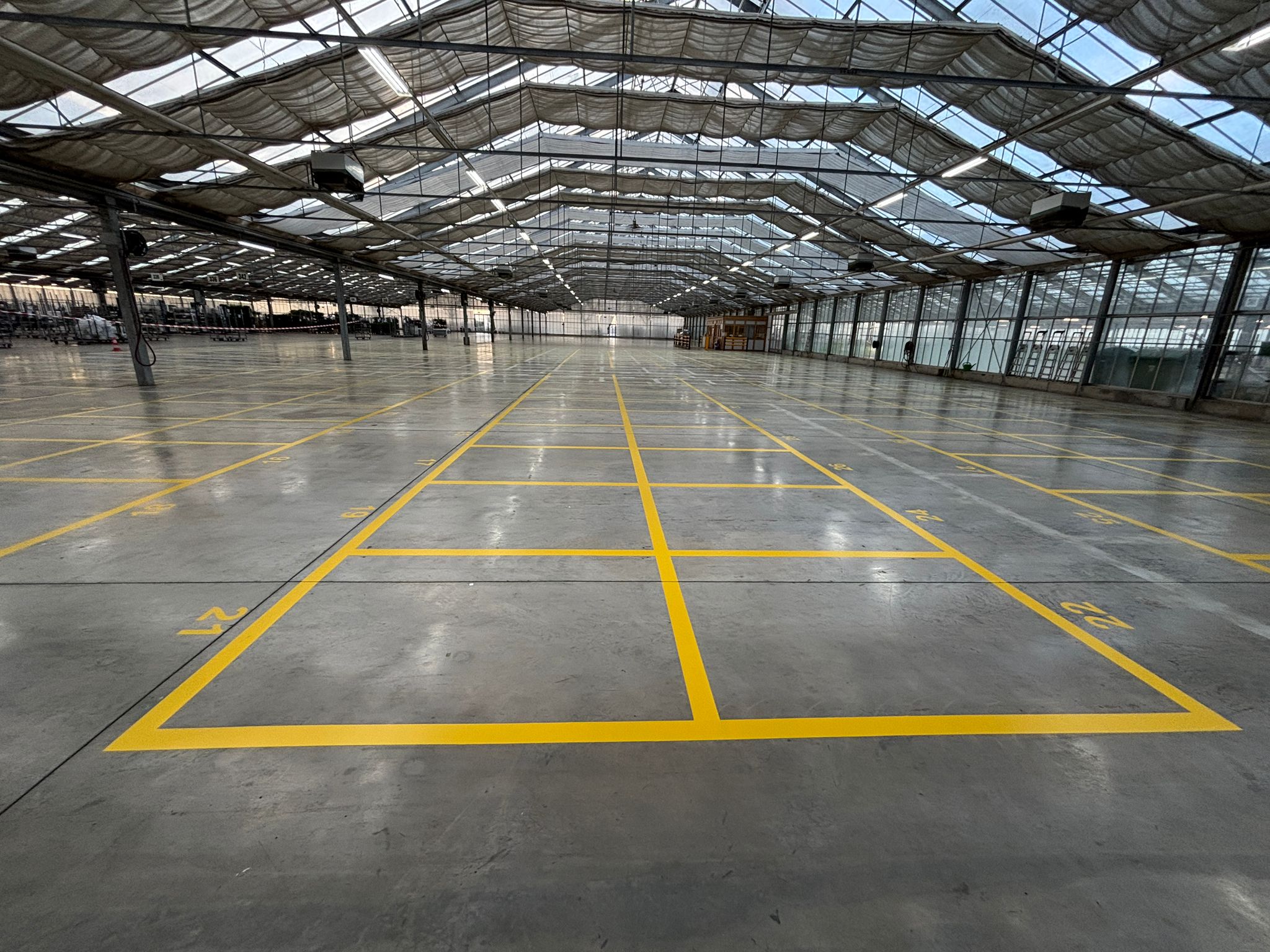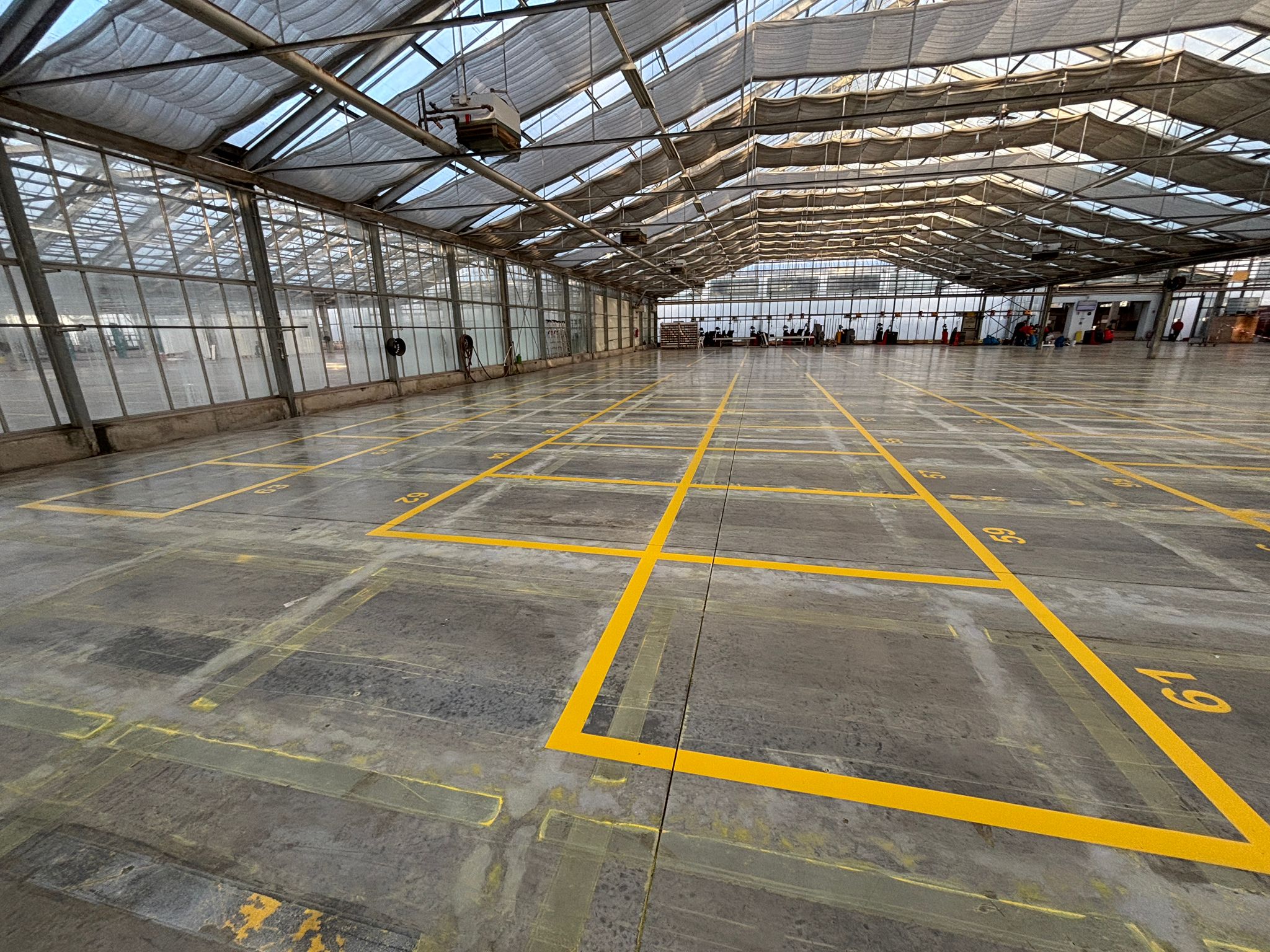 Durchführung der Bodenkennzeichnung für die Ablage von Blumenpaletten. Die Kennzeichnung beinhaltete auch Textcodes und Zahlen.